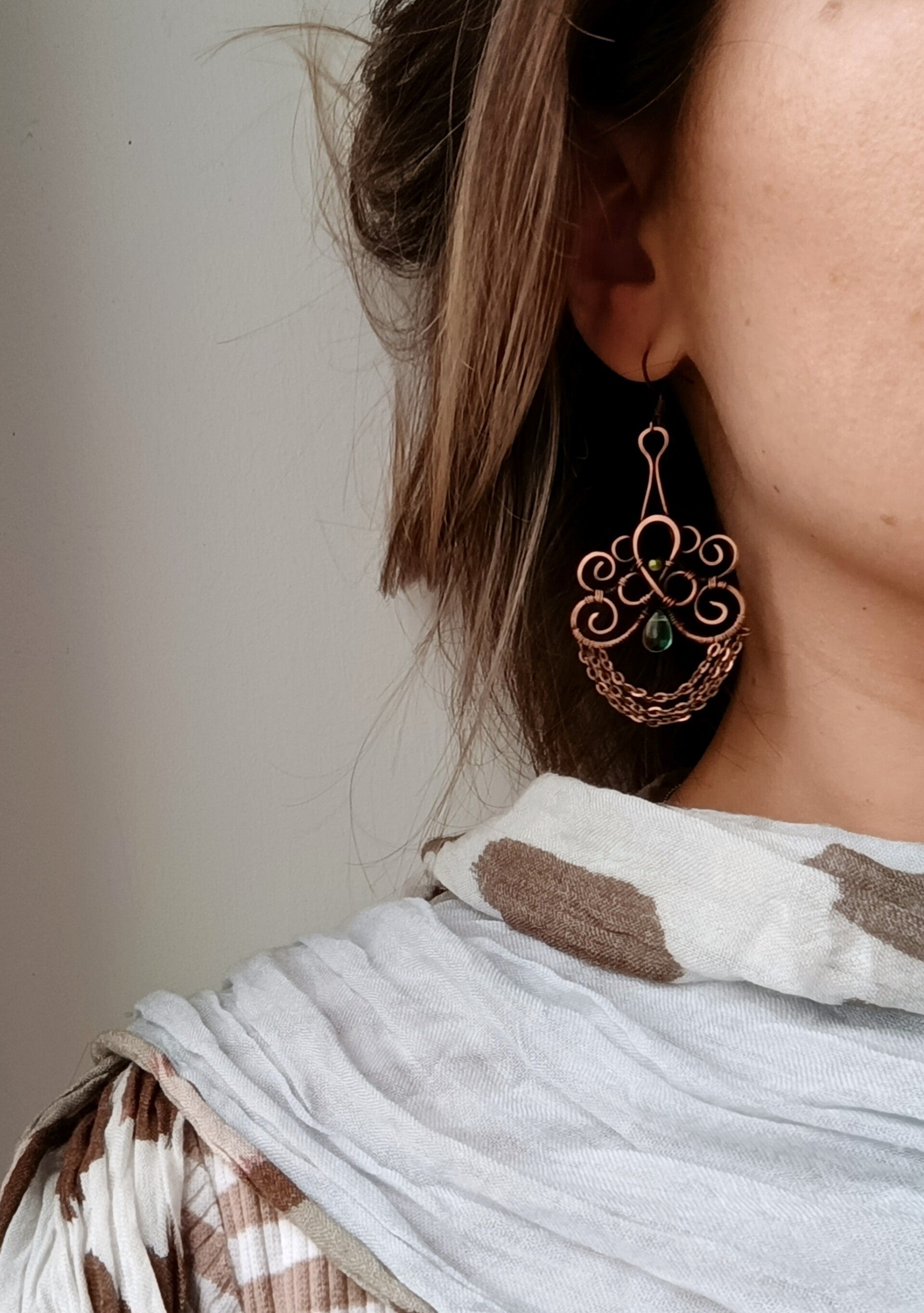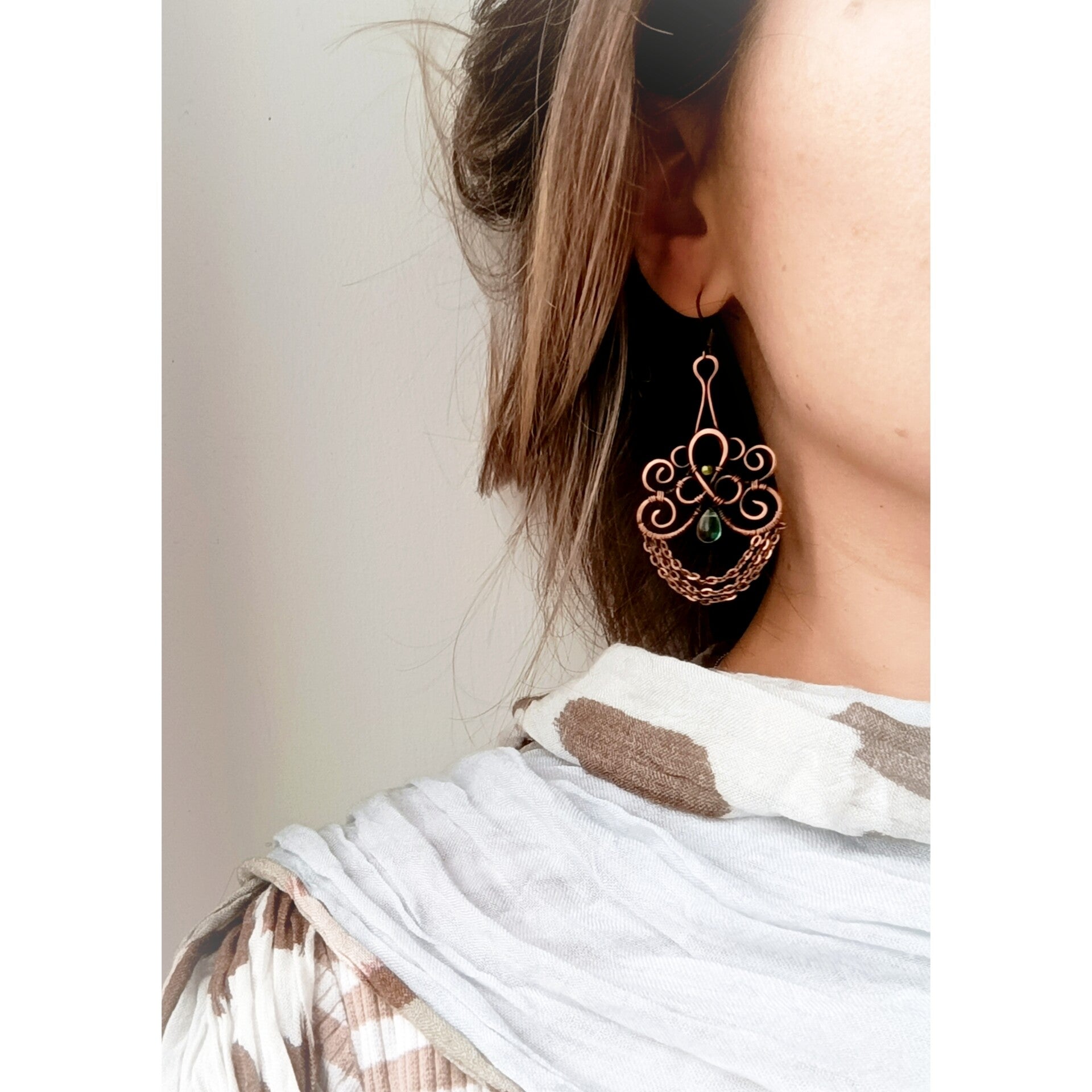 New handmade elegant earrings made of copper and small glass pearls. Oxidized and polished for a better patina effect. Suitable for everyday life, a holiday or a gift for a loved one, friend or relative.
