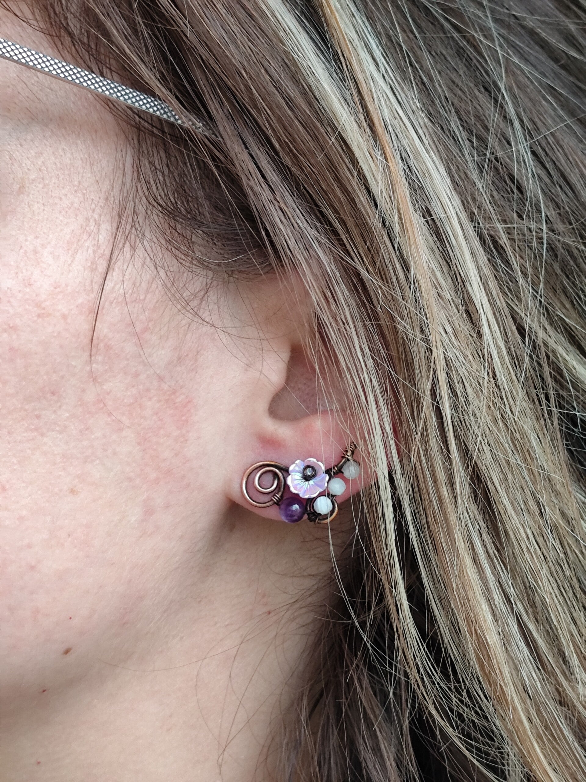 Erleben Sie die Magie von exquisitem Designerschmuck und genießen Sie diese kleinen und eleganten Kupferohrringe aus natürlichem Amethyststein, kleinen Mondsteinen und Blumen. Dieses Modell wurde komplett von mir mit meiner Liebe und Sorgfalt für jedes Detail entworfen und hergestellt. Begeistern Sie Ihre Lieben für die Feiertage oder einfach ohne Grund mit einem einzigartigen und stilvollen Geschenk und geben Sie ihnen das Gefühl, einzigartig und besonders zu sein.
