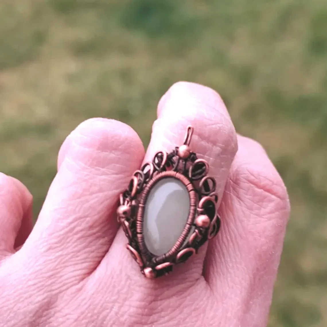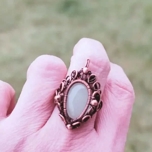 Discover the magic of handmade with this exquisite copper ring with beautiful curved elements and a beautiful natural stone in the heart of the ring.