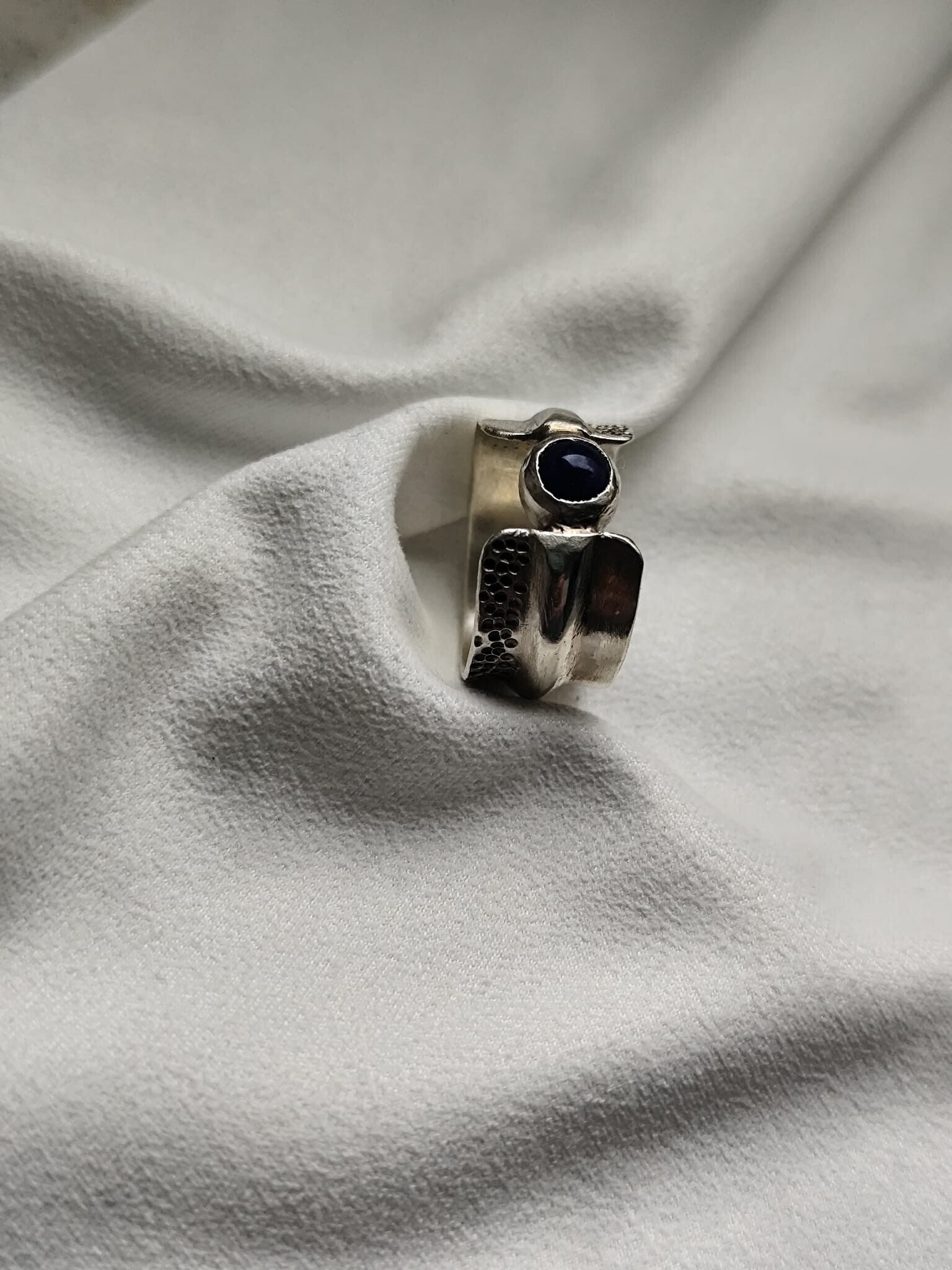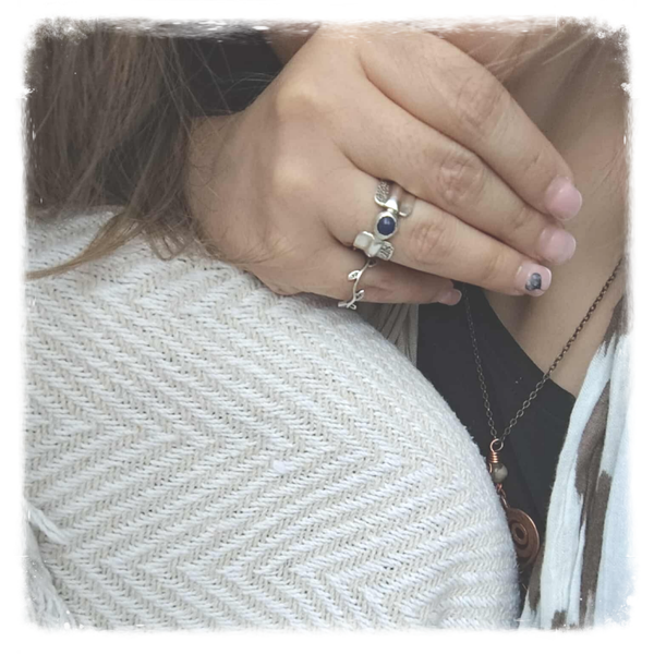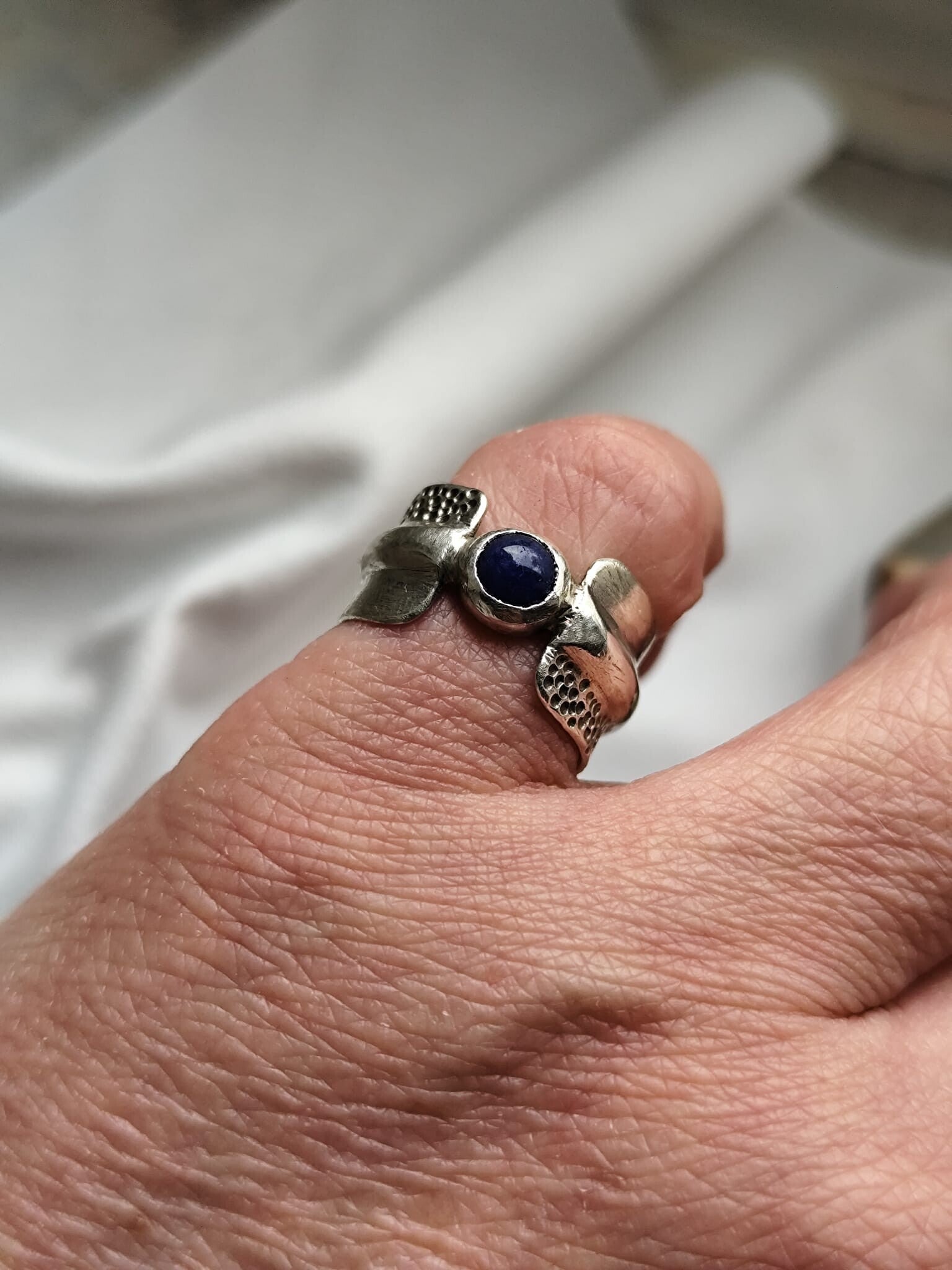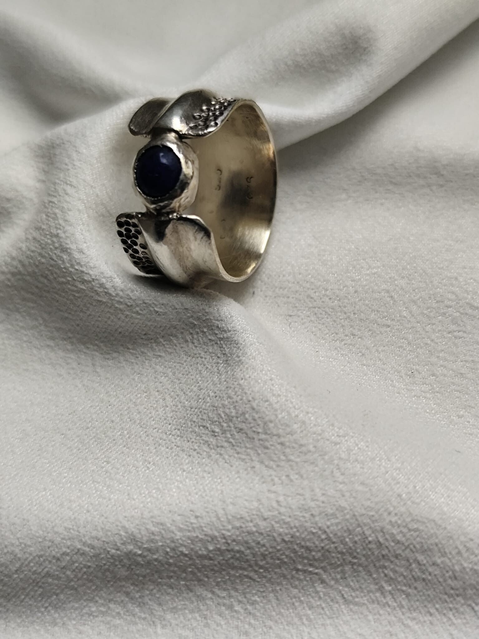 Discover the magic of handcrafting with this unique sterling silver ring adorned with a beautiful, natural Lapis Lazuli stone embedded in the core. Crafted with meticulous attention to detail - hand-cut, forged, soldered and oxidized to achieve a distinctive, authentic look. The final polish gives the metal a warm shine that beautifully contrasts with the intertwined natural stones.