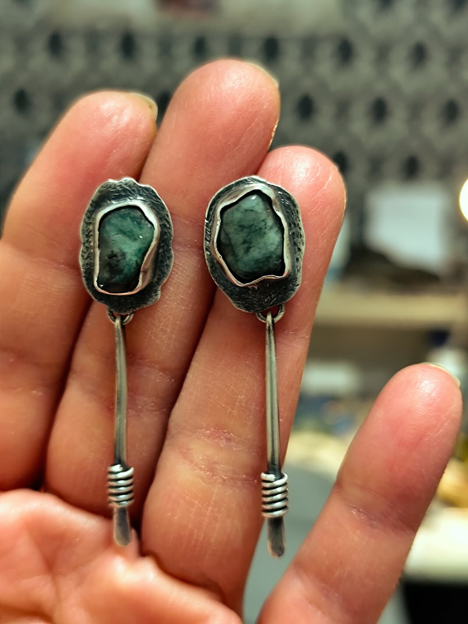These handmade earrings by Radost Jewelry are crafted from solid silver and feature a natural, uncut emerald, preserved in its raw, organic form. Each stone has its own unique shape, texture, and rich green tones, making each piece truly one-of-a-kind.