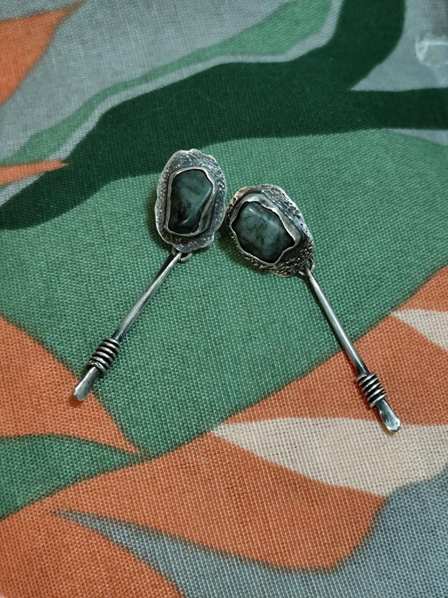 These earrings are one of a kind and cannot be repeated. The design is developed according to the size and shape of the stone, but if you want similar ones, you can contact me by email to discuss your wishes. I currently have several similar shaped stones.